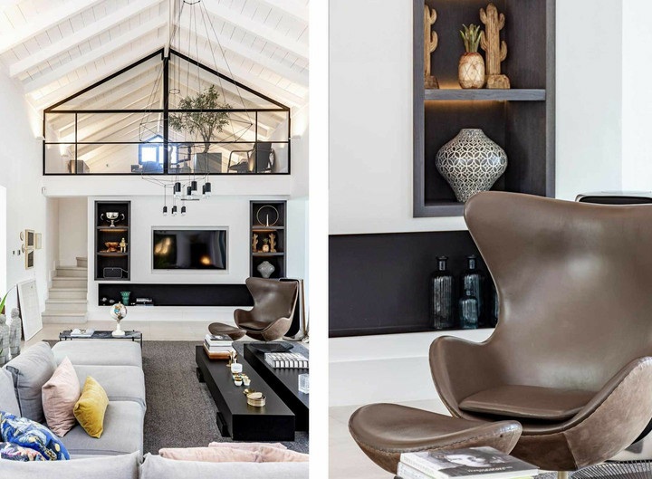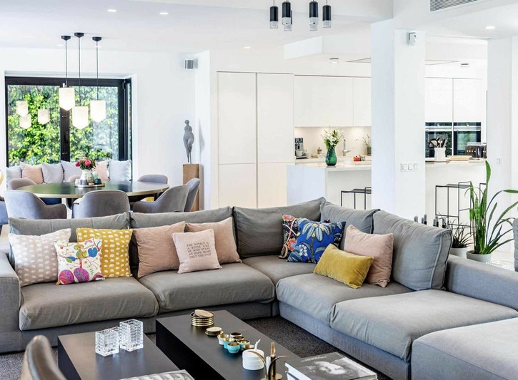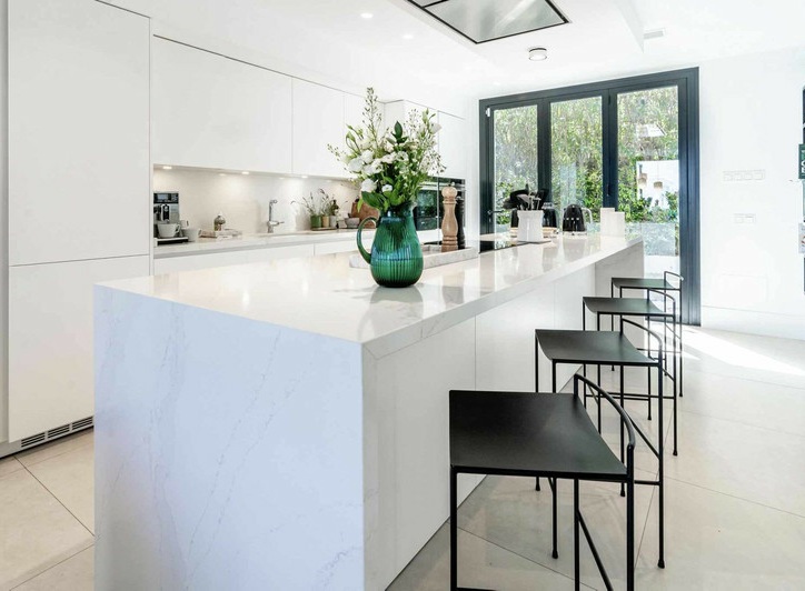 The villa spans 552m² of built area over multiple levels, featuring 4 spacious bedrooms and 5 luxurious bathrooms. The heart of the home is the open-plan living area with its bespoke Santos kitchen, complete with a central island perfect for casual dining and entertaining. A sophisticated Sonos sound system is integrated throughout the property, while solar panels ensure energy efficiency.
