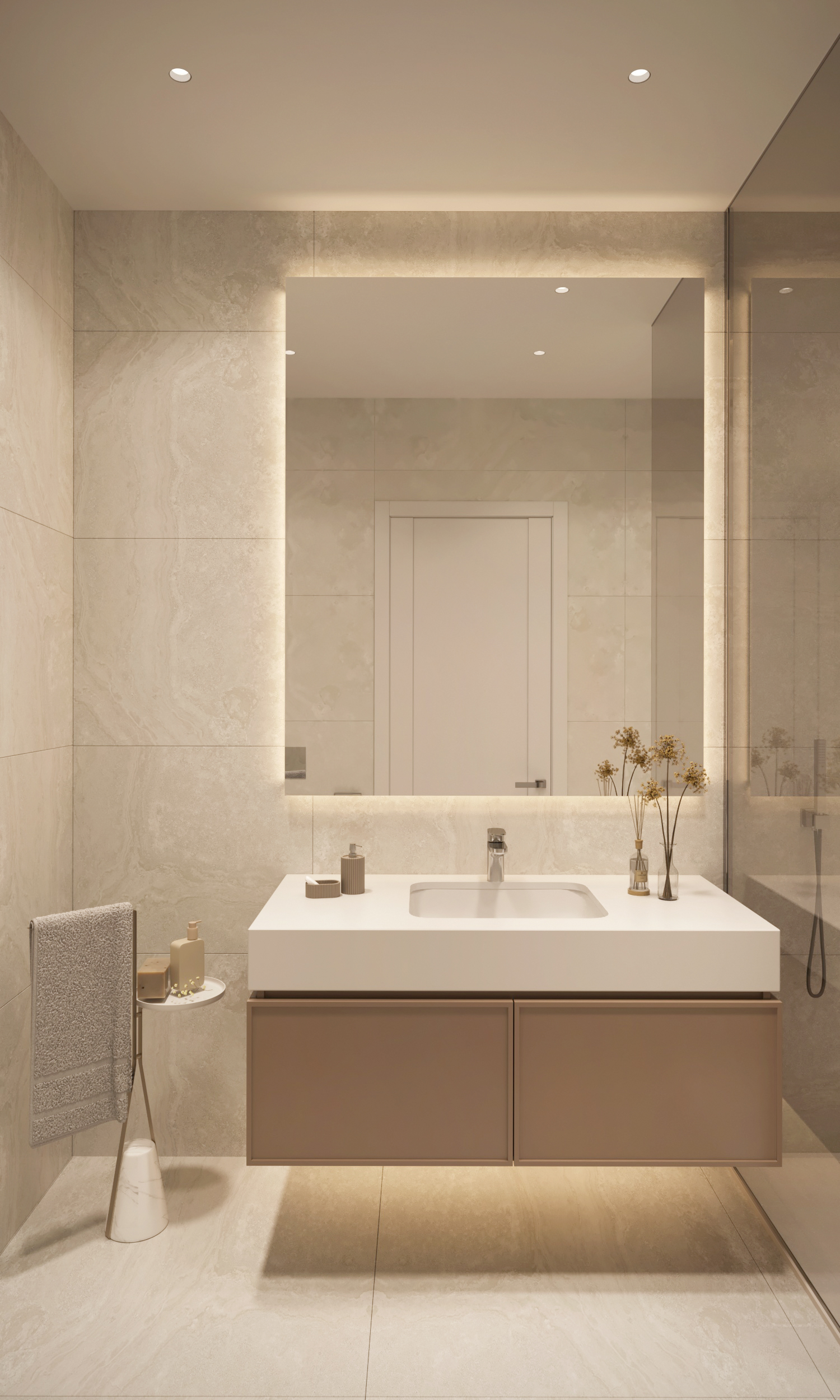 Designer bathrooms with large-format tiles, backlit mirrors, floating vanities, and premium fixtures — finished to a five-star standard throughout.